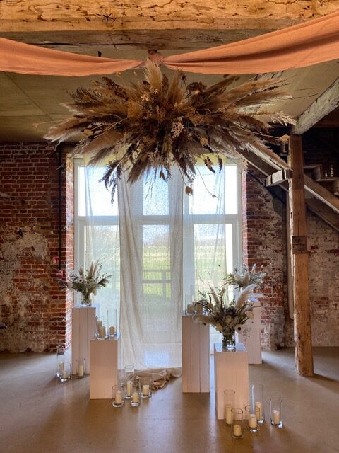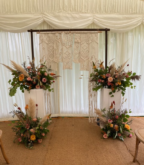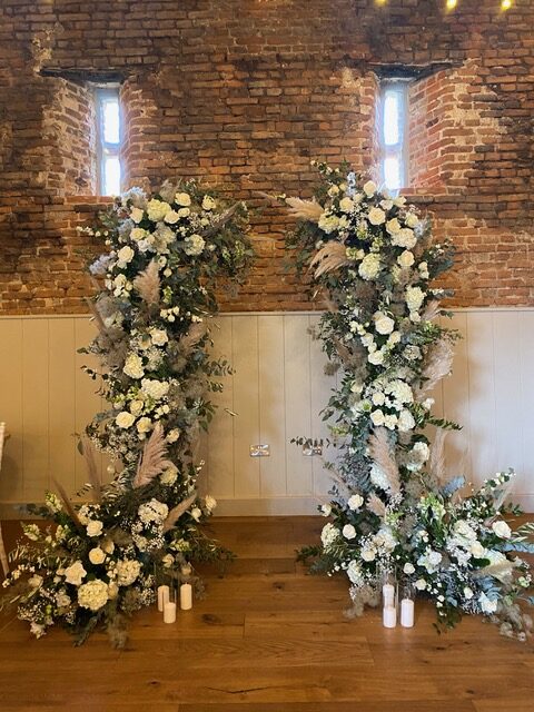 The room where you marry your person, how amazing, to be surrounded by gorgeous blooms too! with each ceremony space being unique I can offer advice as to where best to have florals, thats works with your budget and where would create the most impact. From floral meadows up the aisle, an archway or instillation backdrop, a charming long and low for the ceremony table, pew ends, free standing designs, church flowers, an epic hanging instillation, the possibilities are endless! If its possible, I would always recommend moving your ceremony designs over to the reception, this way you can get double the usage from them, there will always be areas at the reception that you can move the flowers too. I would always recommend a ceremony backdrop if your space allows it, either a deconstructed archway, plinths with florals, a floor meadow archway, or free standing designs, saying your `I DO’S’ with the most beautiful backdrop behind you which will look SO stunning in your pictures!