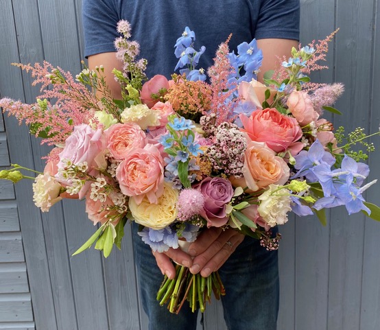 Loose, natural designs with visible movement and different varieties, using seasonal blooms, mixed textures and delicate foliages. Designs often feel relaxed and informal, with an emphasis on how flowers grow in nature rather than symmetry. Flower varieties such as garden style roses, delphiniums, tall larkspur, scabiosa, waxflower with foliages worked through adding to the natural style.
