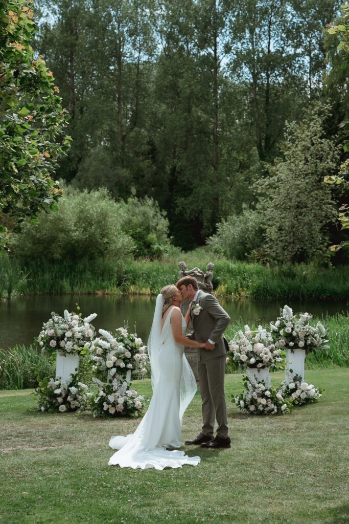 Ella and Jarrad had the perfect summer wedding, their colour scheme was pretty blush pinks and whites with palest powder blue foliages worked throughout. Ella’s bouquet was full of the most stunning blousy roses and had delicate floaty ribbons cascading down for an extra special finish. They had an outdoor ceremony at the charming Oxnead Hall, the weather was just perfect! Floor meadow designs filled with sweet scented stocks, hydrangeas, exquisite roses and lisianthus were dotted up the aisle, with a large set up of hired white pillars with florals making the most amazing backdrop for the I DO’S. The Pillars all had large floral designs on with floor standing arrangements placed around the base of the plinths filled with tall delphiniums, blousy roses, large headed hydrangeas, sweet scented stocks, lisianthus with plates powder blue toned foliages. The aisle meadow designs were then taken up to the barn and placed in-front of the top table with the plinth and floral designs placed either side making a beautiful feature to the top table. The guest tables all had glass bud vases filled with blooms to match in with the rest of the wedding flowers, floor standing floral meadows in-circled the cake table creating a truly gorgeous feature that look just perfect.